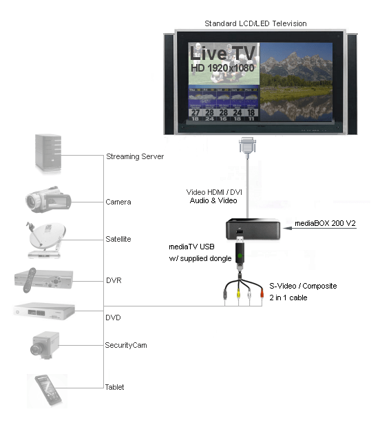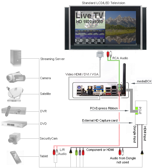 MediaSignage fully supports HD external input using our own PCI-Express capture device and only on the Windows platform (Capture / Tuner live TV is not supported on Linux) . This allows you to connect Live signal from HDMI, composite, component and S-Video directly into your Signage presentation. The Live video feed is assigned to any screen division (zone) you choose. It supports full 1920x1080 High Definition interlace / free smooth playback. The mediaTV Capture device is available in 2 versions, internal and external. The external is designed specifically for our mediaBOX while the external can be used with any standard PCI-Express compliant computer. Again, if you own a mediaBOX, be sure to order the External version. The mediaTV capture device allows you to input an external device’s analog or digital input directly into your Signage Veni presentation and assign it to a specific screen division of your choice. The source can be any Audio / Video device such as DVD, Cable box, Set top box, Satellite dish, game console, camcorder, security camera, tablet and others.