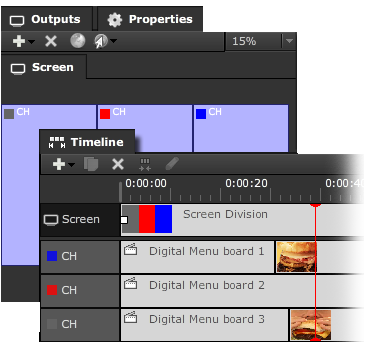 Screen division divide the screen into separate areas (AKA Zones). Areas are assigned a channel number in which you can run independent content. Included in our software is a powerful screen division WYSIWYG editor.
